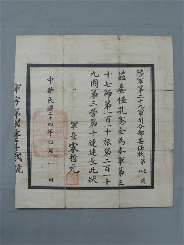 第29軍219團(tuán)3營10連連長孔憲全委任狀